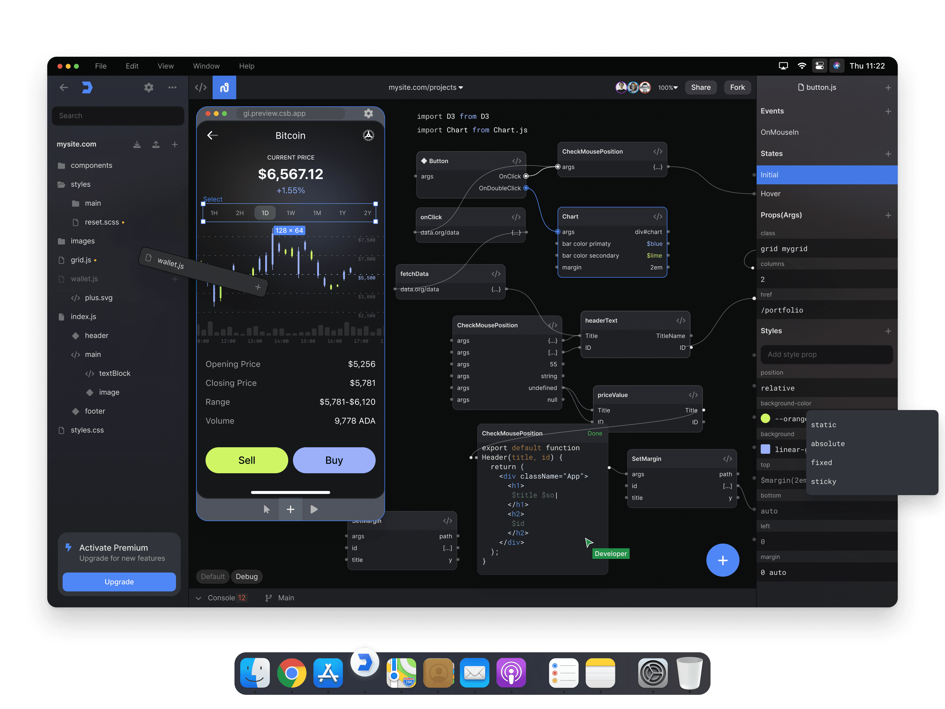 Code editor baced on Monaco editor with all features. Any code have 2 representation, as text and as node. Node functionality is useful for designer and management