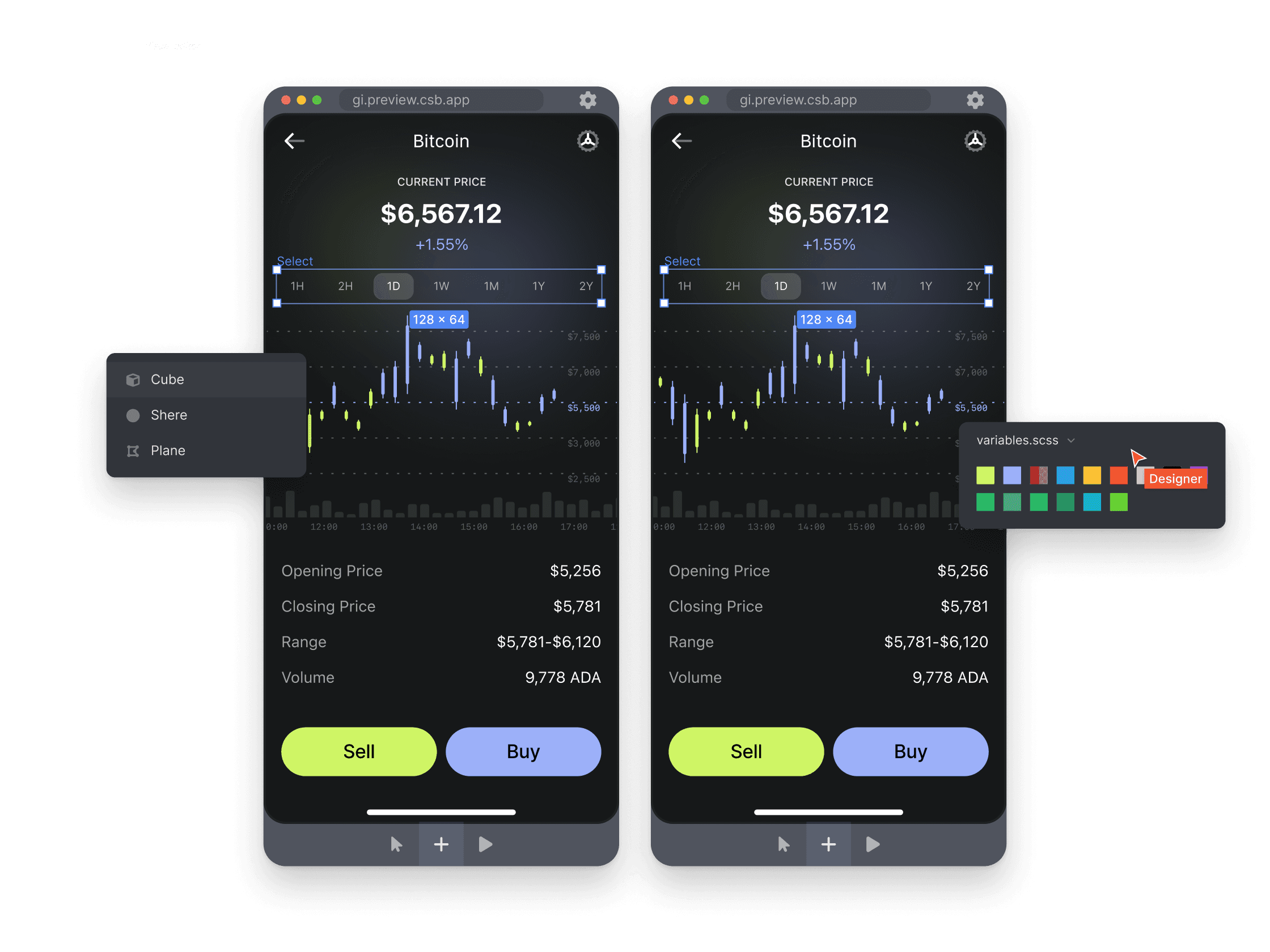 Visual editor and preview. Change colors, add or remove elements, drag, resize, etc.